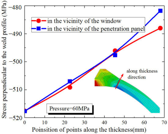 The stress coupled with the residual stress of the welding may make fatigue failure from the inner wall of the reinforcement area. Figure 3 shows the circumferential stress distribution of the spherical hull along two pointed paths in the direction of the hull thickness under the pressure of 60 MPa. Bending is caused by peak stress difference between internal and external surfaces. The ratios of external stress σx1 and internal stress σx2 (the stress vertical to the path along thickness direction) are 0.94 and 0.93, respectively, for penetration area and window area, both of which are critical zone with high stress concentration. As the part in the vicinity of the entrance and exit hatch is designed to be relatively smooth for this cabin, the stress concentration is not obvious, then only the reinforcing parts for the main observation window and the penetration plates are considered presently.