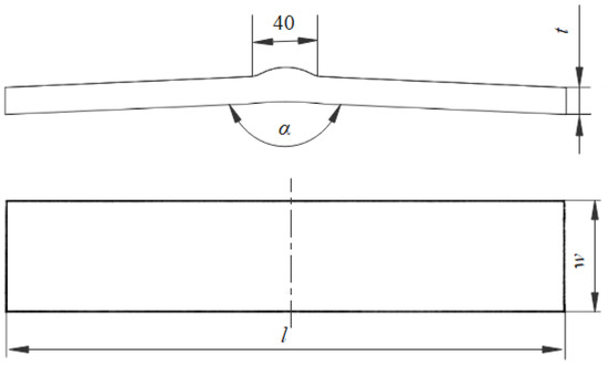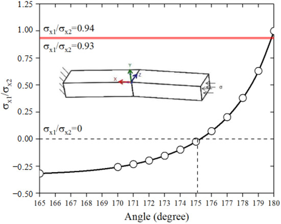 Under the axial pressure of 105 MPa, the ratio of external stress σx1 and internal stress σx2 on the specimen surfaces changes with the angle α shown in Figure 5. In addition, the ratio changes from negative to positive as the internal stress changes from compressive to tensile stress with the increase in the angle. According to Figure 3, the ratio of σx1 and σx2 is about 0.93–0.94, which will lead to the design of the angle a little less than 180°, as depicted in Figure 5. Considering the various factors, such as the difficulty of processing and the principle of conservative design, and to simplify it conservatively, the angle is defined to 175° at which the stress on the outside is at the turning point from compressive stress to tensile stress.