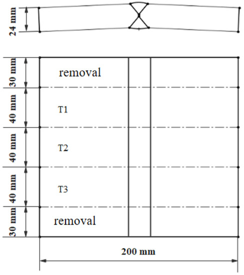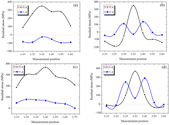 The measurement results are listed in Table 3 and Figure 8a–d for the continuous changing trend. Generally, the residual stress is considered to be constantly parallel to the weld line for simplification. The present study shows that the residual stress along the weld direction σx in the weld central line shown in Figure 8a,c has little change, while σx decreases gradually from the central point to the edge. In the direction perpendicular to the weld, the variation trend of residual stress has more obvious peaks, as shown in Figure 8b,d.