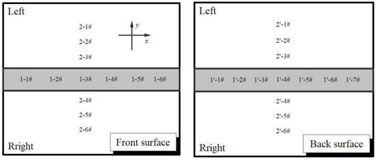 The measurement in the present study is based on ASTM E837-08 [35]. Hole-drilling method is applied for residual stress measurement. The strain gauges are pasted on the part to be tested. During hole-drilling, the stress around the hole will be released, which will cause the strain change in the area around the hole. The actual stress condition of this part can be obtained through calculation. Generally, the center of the weld undergoes rapid heating and cooling, compared to other parts of the weld, which is the area with high incidence of residual stress. However, for the whole welded joint (including weld and base metal), the residual stress distribution data are relatively large, which makes them difficult to extract, and as the input calculation for subsequent crack propagation is significant, the measurement is conducted at several typical positions on both the front and back surfaces of the specimen. Six to seven points are selected on the longitudinal central line of the weld, and three points are pointed, respectively, in the left and the right side at the middle part of the weld. On the front surface, three points with the distance of 15 mm (1-1#), 65 mm (1-2#), 85 mm (1-3#) from the far left and three points (1-4#,1-5#,1-6#) at the right end with the same distance are selected in the middle of the welding seam. Three positions with the distance of 5 mm (2-3#,2-4#), 23mm (2-2#,2-5#) and 38 mm (2-1#,2-6#) from the junction between the weld and the base metal are selected as the measurement points, respectively, on both sides of the weld. The selection of measuring points on the back is similar to that on the front, as shown in Figure 7.