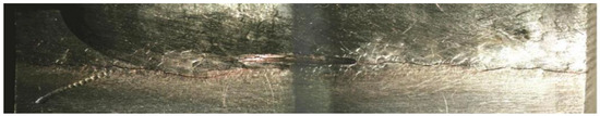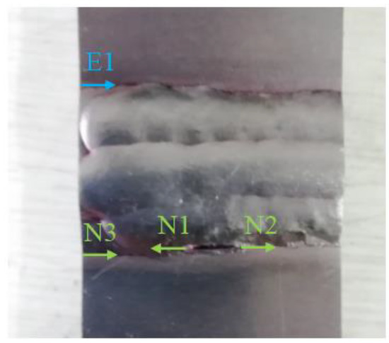 The upper and lower edges of the weld in Figure 10 are observed using a stereo microscope. In addition, the macroscopic photographs of the cracks are shown in Figure 11 and Figure 12. It can be seen from Figure 10 that there is a single crack at the upper edge of the weld, which initiates between the weld and the base material and extends along the edge of the weld. Figure 12 illustrates a plurality of cracks appearing at the lower edge of the weld, and the non-continuous cracks start to propagate at both ends of the notch and the intersection of the weld and the base material. It is worth noting that multi-cracks initiate and propagate along their own direction but interact with each other in the lower edge. The crack denoted by N3 initiates from the edge of the specimen and the crack denoted by N1 initiates from the left point of the notch. The two cracks have a certain longitudinal distance but with equivalent propagation rates. When the two cracks approach to each other and the crack tips will eventually connect together.