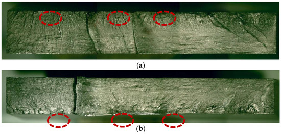High magnification metallographic diagrams shown in Figure 14a,b demonstrate the locations of the fatigue source. Multiple source regions of both fracture sections are located on the surface of the sample. The source region is undulating, and radial stripes converge on the source region during crack propagation. Bead line points to the source area. During the fatigue experiment, the contact and friction of the crack surfaces caused by the compression process make its fracture morphology significantly different, compared to the fracture morphology of tensile crack propagation.