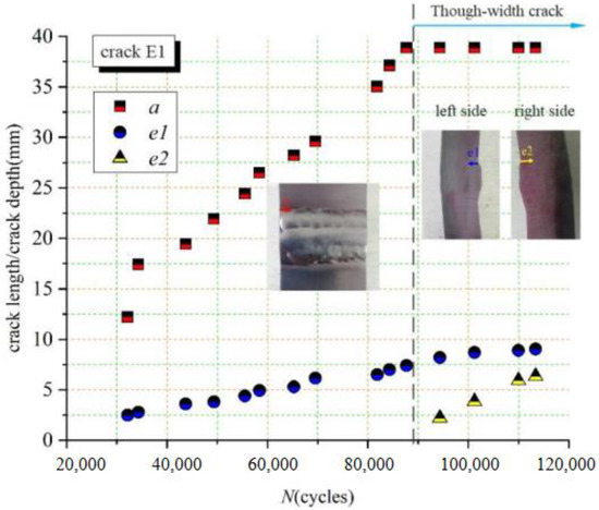 Figure 14a,b show multiple crack sources coexisting in the surface. Limited by the measurement technique in the current experiment, it is unknown which crack initiates first. Macroscopic observation indicates a longer surface crack of about 12.2 mm long and 2.5 mm deep being first observed in the position of E1 but not appearing at the ends of the prefabricated notch as expected. The crack group composed of a dominant crack and some distributed cracks propagating both in the surface and the thickness directions, which is the cause of the final failure after experiencing more than 32,000 load cycles. The length and depth observed from the left side of the crack in position E1 are denoted by a and e1, the propagation rates of which are depicted in Figure 15. The failure is approached when the leading crack propagates to the rightmost side to form a crack of penetrating width after 87,700 load cycles. The through-width crack continues to propagate along the depth direction until the final fracture happens. Its depth can be measured on both sides (data for e1 and e2 in Figure 15).