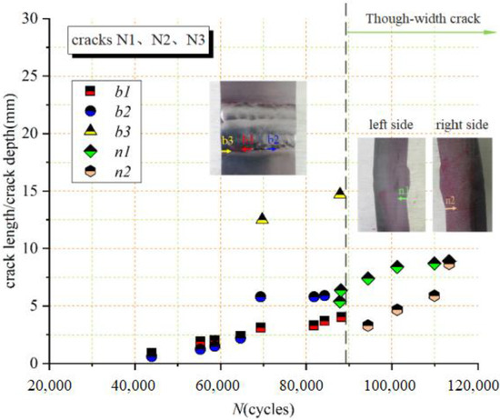 Figure 16 displays the crack growth versus cycles in positions N1, N2 and N3. b1, b2 and b3 are used to express the crack lengths in N1, N2 and N3, respectively. The cracks in N1 and N2 are observed when load cycles reach to 43,939, where the longest length is only 0.9 mm with slower propagating rate, compared to the crack in E1. The crack in N3 is observed after load cycles of 69,737 in which its crack length is 12.5 mm. The cracks from N1 and N3 connected with each other at load cycles of about 88,000. Then, the crack from N2 keeps on propagating until to the rightmost of the width followed with continued propagation in depth.