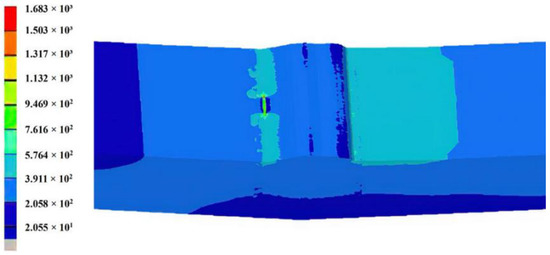 Based on the experimental observation, cracks successively appeared at the upper and lower edges of the weld, and it is reasonably supposed that crack E1 in the upper side and the cracks N1, N2, N3 in the bottom side propagate independently. The geometric correction factor Y(a) corresponding to the crack length is pre-calculated based on the above numerical model to represent the structure geometry effect on the stress intensity factor, K, and the mathematical expression of Y(a) will be obtained by fitting for the calculation of the subsequent crack propagation. Crack E1 is firstly introduced at the upper edge of the weld. The initial size of the elliptical crack E1 is defined as the value when the number of load cycles calculated in Figure 15 reaches 32,160. The length and depth of the crack are 12.2 mm and 2.5 mm, respectively. Then, the crack N2 is introduced to the right of the prefabricated notch in the welding area, and the size of the crack under 43,939 load cycles, as shown in Figure 17, is defined as the initial crack size. The crack shape is assumed to be round with the radius size of 0.6 mm. Re-meshing is conducted after the crack introduced and contact effect is set between the crack surfaces. The residual stress field based on the measurement data in Figure 8 is applied on the crack surface.