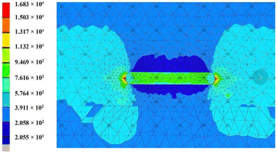 The three-dimensional modelling by using the commercial software FRANC3D for the equivalent welling joint with prefabricated notch and basically consistent weld zone shape is carried out with a refined mesh size of 1 mm in the cracked area. The weld area and its transition area with the base metal are meshed by tetrahedral element, and the other areas are meshed by hexahedral element; finally, the total element number is 122,093, as shown in Figure 17. Fixed constraint is applied in one end of the model and the other end is subjected to an axial compression of 235.2 kN. Static analysis is carried out to check the equivalent stress nephogram of the overall model and the stress nephogram in the vicinity of the prefabricated notch. Obvious stress concentration areas are shown in Figure 18 and Figure 19, verifying the effects loading and constraints.
