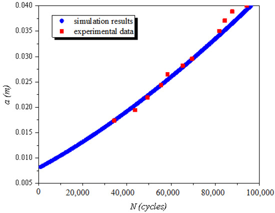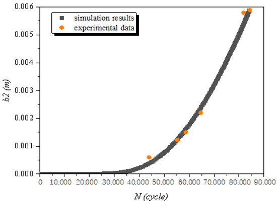 The value of a in the crack E1 and the value of b2 in the crack of N2 are used to compare with the experimental data as typical parameters of calculation, which are, respectively, shown in Figure 20 and Figure 21. The experimental data agree well with the calculated curve. This not only verifies the improved crack growth rate model proposed by our research group, but also proves the reliability of the numerical simulation method adopted in this paper.