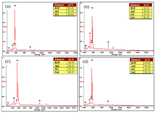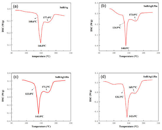 - The result of the differential thermal analysis shows that the addition of In elements reduces the solid–liquid phase temperature of the alloy solder. The SnBiAg–xIn (x = 0, 0.5, 1.0, 1.5) alloy solder has a small melting range of 8 °C and forms reliable joints during the soldering process.