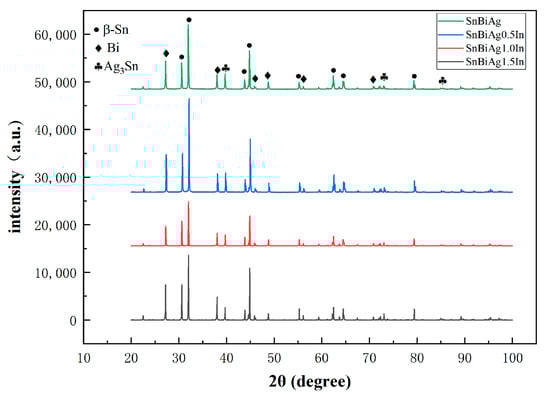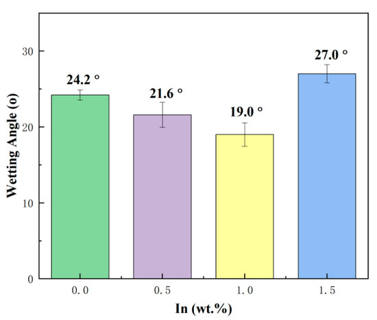 - The wettability of the SnBiAg–xIn alloy solder on the surface of the Cu substrate first increases and then decreases with the addition of In elements. When 1.0% of the In element is added, the wettability angle of the alloy on the Cu substrate surface is the smallest at 19.0°.