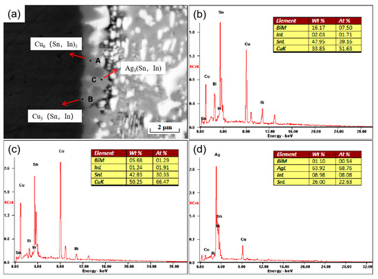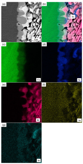 3.3. SnBiAg–xIn/Cu Interface Organization Analysis
