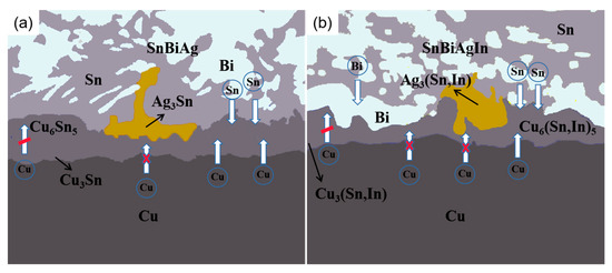 - At the SnBiAg1.0In/Cu interface, where the In atoms replace some of the Sn atoms, the IMC is mainly Cu6 (Sn, In)5, whose growth rate is controlled by the diffusion of the Cu elements in the matrix and the Sn elements in the solder, but is also influenced by the In elements. The Bi and Ag3 (Sn, In) phases formed at the interface also affect the growth of the IMC.