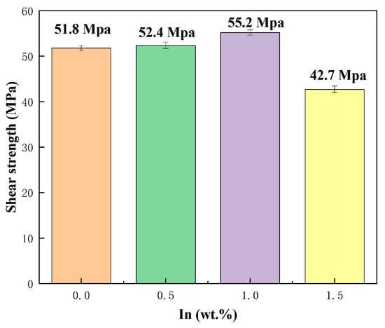 - The SnBiAg–xIn (x = 0, 0.5, 1.0, 1.5)/Cu joint fractures from the IMC–solder side. Its shear strength first increases and then decreases with the addition of In elements. The highest shear strength of 55.1 MPa was achieved when 1.0% of In was added to the soldered joint.