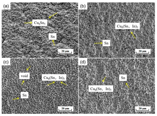 3.5. Shear Strength and Failure Analysis of SnBiAg–xIn/Cu Soldered Joints