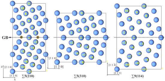 Σ5(210), Σ5(310), and Σ9(114) symmetric tilt GBs, for calculation, are constructed on the basis of an optimized γ-Fe structure, to construct supercells (Figure 1). The dark gray dotted line is the plane of the GB. In these three GBs, numbers 1–11 represent the atomic layers parallel to the GB plane, and negative values represent the equivalent symmetrical atomic layers. Σ5(210) GB and Σ9(114) GB have 20 atomic layers, and Σ5(310) GB has 16 atomic layers. In the Σ5(210) GB structure, 0 represents a vacancy in the GB plane. On the basis of the optimization of the three GB structures, the binding energy and segregation energy of S and alloy compositions (Mo and Cr), at each atomic layer in the GBs, are calculated. Given the small atomic radius of S, the calculation results of its vacancies at the GB are also considered.