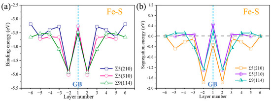 The binding energies and segregation energies for S at each atomic plane in the substitution system were calculated (as demonstrated in Figure 2), to analyze the occupancy tendency of S in the Σ5(210), Σ5(310), and Σ9(114) GBs. The blue dotted line shows the position of the GB plane. The binding energies of S at different positions in the three GBs are all negative, indicating that S can exist in the three GBs and form stable structures. Figure 2b shows the segregation energies of S at different planes in the three GB structures. S has the lowest segregation energy in the adjacent regions of the three GBs, that is, layers −2 and 2. The lowest segregation energy near the Σ5(210) GB is −1.77 eV. The lowest segregation energies of S in Σ5(310) GB and Σ9(114) GB structures are −1.29 eV and −1.26 eV, respectively. Sulfur is most likely to permeate the interface of the three GBs, and the segregation tendency in Σ5(210) GB is the strongest. The above calculation results show that S easily permeates the grain boundary. The segregation of S will produce embrittlement behavior, leading to intergranular fracture [22].