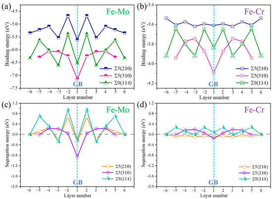 Binding energies of (a) Mo and (b) Cr in different layers of Σ5(210) GB, Σ5(310) GB and Σ9(114) GB. Segregation energy of (c) Mo and (d) Cr in different layers of Σ5(210) GB, Σ5(310) GB and Σ9(114) GB.