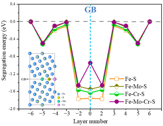 The same S segregation sites at Σ5(210) GB, containing Mo or Cr at the interface (Fe-Mo-Σ5(210) GB and Fe-Cr-Σ5(210) GB), and Mo-Cr coexisting at the interface of Σ5(210) GBs (Fe-Mo-Cr-Σ5(210) GB) are considered simultaneously, to investigate the effect of Mo and Cr on S segregation, and segregation energies are also calculated (Figure 4). The segregation energy of S in the GB layer is the segregation energy of S at position 0. When S is located on the GB 0 layer and the second layer, Mo or Cr at the GB increases the segregation energy of S and has a certain inhibitory effect on the segregation of S. By comparison, the inhibitory effect of Mo at the GB is higher than that of Cr, which is consistent with the fact that high-Mo austenitic steel is widely used in sulfur-resistant corrosion environments [26,27,28]. The segregation energy of S on layer 0 in Fe-Mo-Cr-Σ5(210) GB is larger than that of S in other systems, which shows that the combined effect of Mo and Cr is higher than that of single Mo or Cr. When Mo and Cr are at the GB at the same time, the segregation energy of S at the grain interface gap is inhibited the most. Results show that Mo and Cr can inhibit the effect of sulfur on GBs.
