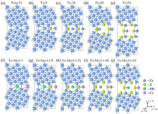 In comparison with the S segregation at clean Σ5(210) GB, the presence of Mo and Cr at the interface is shown to restrain S segregation. The Fe-Mo-Cr-Σ5(210) GBs with different numbers of S atoms are optimized, to further analyze and verify the aggregation of S in the Σ5(210) GB, containing Mo and Cr at the atomic level. In optimized structures, the number of S atoms is increased in the GB region, and structural changes are analyzed (Figure 5f–i). Notably, in the Fe-Mo-Cr-Σ5(210) GB structural system, increasing the number of S atoms in the GB results in S still causing evident local distortion of the lattice. However, the change in the Fe-Mo-Cr-Σ5(210) GB, caused by S, is significantly weaker than that of clean Σ5(210) GB. Accordingly, the existence of Mo and Cr in the GBs can affect the deformation of the GB structure caused by the aggregation of S. When the number of S atoms is 2 or 4, the layer-to-layer and atom-to-atom expansion in the GB region of the Fe-Mo-Cr-Σ5(210) GB is significantly prevented, compared with those in clean Σ5(210) GB. As the number of S atoms increases to 6, the entire interface cracks.