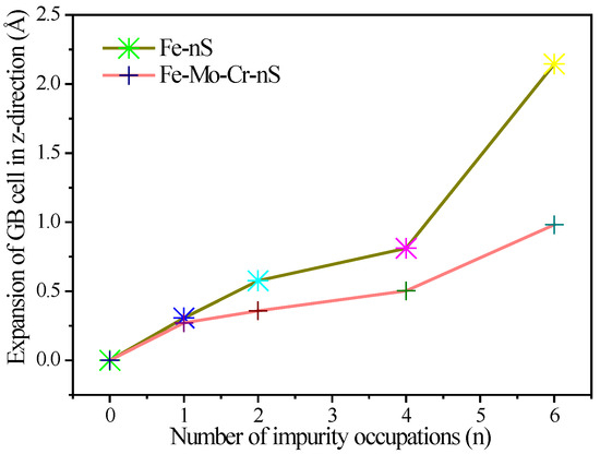 To further investigate the effect of S on the lattice parameters of clean Σ5(210) GB and Fe-Mo-Cr-Σ5(210) GB, we calculate the expansion of the clean Σ5(210) GB and Fe-Mo-Cr-Σ5(210) GB in the z-axis direction, as a function of the number of S atoms segregated at the interface region (Figure 6). A high sulfur content results in high influence on the z-axis in the GB structure. When only one S atom is present in the structure, the existence of Mo or Cr in the interface region has a negligible effect on the expansion of the GB in the z-axis direction. When the number of S atoms is more than 2, the addition of the S reduces the expansion of the Fe-Mo-Cr-Σ5(210) GB in the z-axis direction, to significantly less than that of the clean Σ5(210) GB, and the deviation is 0.22 Å. This result suggests that Mo and Cr can inhibit the GB expansion caused by the aggregation of S in the GB region, and the inhibition effect becomes remarkable with increasing sulfur content.