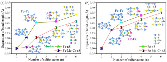 In Figure 5, the addition of S at the GB has the most evident local effect on the interaction of the atoms in the first and third layers. Figure 7 shows the change in bond length between the Fe (or Mo, Cr) atoms in the first and third layers in the two GB structural systems, to enable understanding of the influence of the bonding characteristics between atoms in the adjacent S region, and determine the role of Mo and Cr. Figure 7 shows that, compared with GBs without S, when S is added in S-segregated sites, the bond lengths of Fe-Fe, Mo-Fe, and Cr-Fe increase. When Mo and Cr atoms exist in the interface, the bond-length expansion induced by S is weaker than the structure without Mo and Cr. For clean Σ5(210) GB, with increasing sulfur content in the GB region, the resultant increase in bond length between the first and third layers of Fe atoms is 0.104, 0.253, 0.264, and 0.33 Å, whereas the expansion of the Mo-Fe bond length in the Σ5(210) GB with Mo and Cr are 0.013, 0.108, 0.205, and 0.265 Å (Figure 7a). Figure 7b demonstrates that in the other group: Fe (Cr)-Fe, bond length increases with different sulfur content, where the resultant increases in the Fe-Fe bond length are 0.181, 0.252, 0.323 and 0.383 Å, and those in the Cr-Fe bond length are 0.179, 0.206, 0.284, 0.35 Å. The comparison shows that Mo and Cr in the interface has a significant inhibitory effect on the bond length between interlayer atoms in the region.