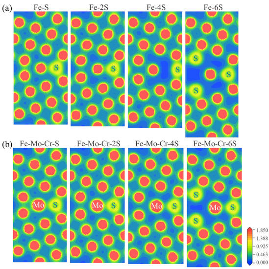 To shed light on the role of S in the clean Σ5(210) GB and Fe-Mo-Cr-Σ5(210) GB, we further analyze the electronic properties of different structural systems. The charge density distribution can directly reflect the interactions between atoms at GBs. The calculated charge densities of Fe-Mo-Cr-Σ5(210) GB with different S contents in comparison with those of clean Σ5(210) GB are displayed in Figure 8. As shown in Figure 8a, the presence of 1 or 2 S atoms in the interstitial position in the GB is beneficial to the bonding between atoms at the GB. However, if four or more S atoms are added in the GB region, the charge densities in the GB area become much more diluted than those with minimal S content. Thus, the interatomic bonds of the GB with six S atoms are weak and almost negligible. This is consistent with the experimental results that sulfur segregates to be mainly responsible for intergranular corrosion in 304 stainless steels [25]. However, the existence of Mo and Cr elements can alleviate this phenomenon, which is conducive to improving the interaction between S and adjacent atoms and reducing the influence of S on the interface. Figure 8b shows that whether Σ5(210) GBs contain Mo and Cr, the distribution trends of the charge densities of the two GB structures, with increased number of S atoms, are consistent. However, when the number of S atoms is the same, the interatomic charge distribution of the Mo-Cr-Σ5(210) GB is close, that is, the atomic interaction is strong. Therefore, Mo and Cr can improve the adhesion of the GB structure with S segregation. These results are in good agreement with the findings that Cr and Mo can enhance the GB cohesion [22].
