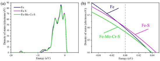 In the Σ5(210) GB structure, the presence of Mo and Cr in the interface remarkably affects S. The charge density of the Σ5(210) GB containing S shows that S weakens the charge interaction of its neighboring atoms. To explain this phenomenon, the total density of states and local density of clean Σ5(210) GB are calculated, where Σ5(210) GB contains an S atom at interface (Fe-S-Σ5(210) GB) and Mo-Cr-Σ5(210) GB contains an S atom at interface (Fe-Mo-Cr-S-Σ5(210) GB) (Figure 9). Figure 9a shows the total density of states diagram of three GB systems. The inclusion of these elements in clean Σ5(210) GB has little effect on the shape of the total density of states, position of each energy level, and strength of the GB system. Some differences in electron density remain at the Fermi energy level. A low value at the Fermi level indicates a stable structure [29]. In the local density of states at the Fermi level of Figure 9b, compared with that of the Fe-Σ5(210), the number of electrons at the Fermi energy of the Fe-S-Σ5(210) GB increases slightly, indicating that the electrochemical stability of the system is reduced. The electron number at the Fermi energy of Fe-Mo-Cr-S-Σ5(210) GB has a slight decrease in the number of electrons, compared with that of the clean Σ5(210) GB, indicating that the electrochemical stability of the GB system is improved. This result indicates that the Σ5(210) GB segregation of Mo and Cr is conducive to improving the electrochemical stability of the Fe-S-Σ5(210) GB structural system.