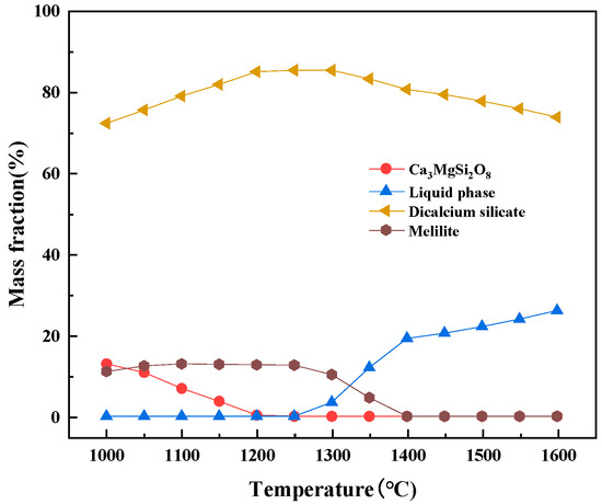 The magnesium-slag-melting temperature was measured by the CQKJ-II-type slag melting temperature characteristic tester. After the equipment reached the upper temperature limit of 1600 °C, the magnesium slag did not show obvious melting characteristics. Factsage 7.1 thermodynamic software was used to conduct the thermodynamic analysis of magnesium slag, and it was calculated that the initial melting temperature of magnesium slag was 1259 °C, while the complete melting temperature was 2008 °C. Figure 2 shows the change of phase of magnesium slag with the temperature, and Figure 3 shows the variation in viscosity and temperature of magnesium slag. When the temperature was raised from 1000 °C, the mass fraction of Ca3MgSi2O8 and melilite in magnesium slag was gradually reduced, and the mass fraction of dicalcium silicate (Ca2SiO4) was slowly increased before the liquid phase was generated. When the temperature reached 1259 °C, the liquid phase in the system began to be generated. At this time, as the temperature increased, the mass fraction of dicalcium silicate (Ca2SiO4) was gradually reduced, and the slag viscosity also showed a downward trend. When the temperature was raised to 1350~1450 °C, the viscosity of magnesium slag was still at a high level.
