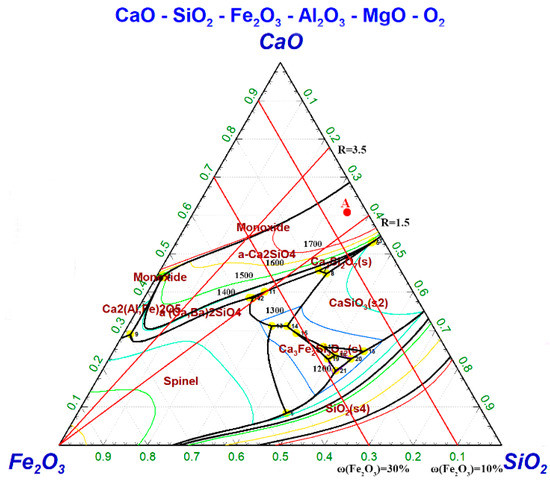 The pseudo-pentad phase diagram of CaO–SiO2–Fe2O3–MgO–Al2O3 is shown in Figure 4; point A is the composition point of magnesium slag A. When the ω(MgO) and ω(Al2O3) in magnesium slag were kept unchanged, the basicity was adjusted by 1.5–3.5, and ω(Fe2O3) was adjusted to 10–30%, the smelting conditions were still not satisfied. Therefore, the mass fractions of ω(MgO) and ω(Al2O3) needed to be adjusted simultaneously to improve the slag system structure to fulfill the smelting requirements.