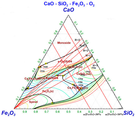 The pseudo-quinary phase diagram of CaO–SiO2–Fe2O3–Al2O3–6%MgO is shown in Figure 8. The increase in Al2O3 content led to a reduction in the liquid-phase region, but it was conducive to the melting of high-basicity slag, and the minimum content of Fe2O3 in the liquid-phase region was still greater than 30%. This met the dephosphorization conditions for steelmaking. At this time, the basicity, melting temperature and oxidizability of the slag system could be satisfied for the dephosphorization conditions of steelmaking.