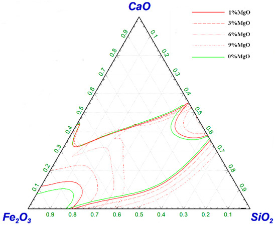 Figure 6 shows the effect of MgO on the liquid-phase zone of the CaO–SiO2–Fe2O3 slag system at 1450 °C. When the MgO content increased from 1% to 3%, the area of the liquid phase did not change significantly, and when it continued to increase to 9%, the area of the liquid phase was rapidly reduced. The excessive MgO content resulted in the presence of a large number of unmelted MgO particles in the slag, which affected the melting temperature and viscosity of the slag and was not conducive to the melting of the slag [20]. When the MgO content was 6%, the slag system still had high oxidizing properties, and the liquidus line tended to the high SiO2 region, and the slag with low basicity in the early stage of smelting was accelerated to melt. Additionally, the MgO content in slag should be kept in a reasonable range to avoid serious erosion of the furnace lining due to the low MgO content, in which the life of the converter will be affected. Therefore, the MgO content in the magnesium-slag-based dephosphorization agent was set to 6% in this study.