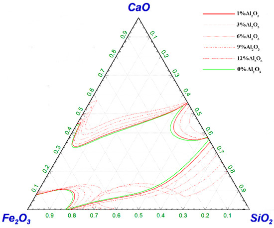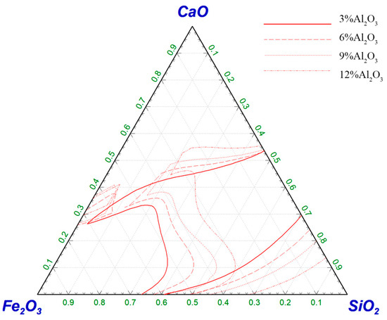 Figure 7 shows the effect of Al2O3 on the liquid-phase zone of the CaO–SiO2–Fe2O3 slag system at 1450 °C. With the increase in Al2O3 content, the liquid-phase line gradually tended to the high CaO region, and the dense Ca2SiO4 outer layer in the slag was loosened by Al2O3, which was conducive to the diffusion of Fe2O3 and SiO2 into the lime [21], and the melting of the slag was accelerated. When the Al2O3 content was in the range of 1–12%, the slag system had a wide range of basicity and a high oxidizability, which was consistent with the composition of slag in the pre-phosphate removal stage.