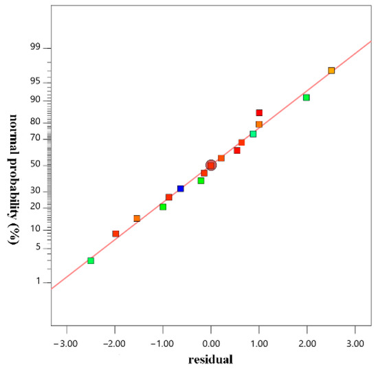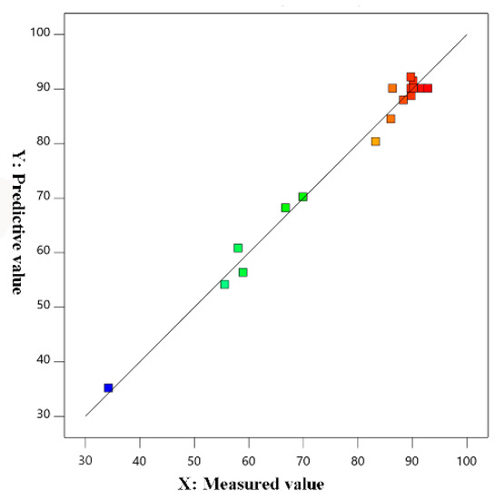 The normal probability distribution of the residual dephosphorization rate is shown in Figure 9, and the comparison between the measured value and the predicted value is shown in Figure 10. The normal probability-distribution points of the residuals were located on or immediately on both sides of the straight line: the measured and predicted values were in good agreement, and the correlation between them was high. It showed that the selected model could be used to guide the composition optimization of the magnesium slag dephosphorization agent.