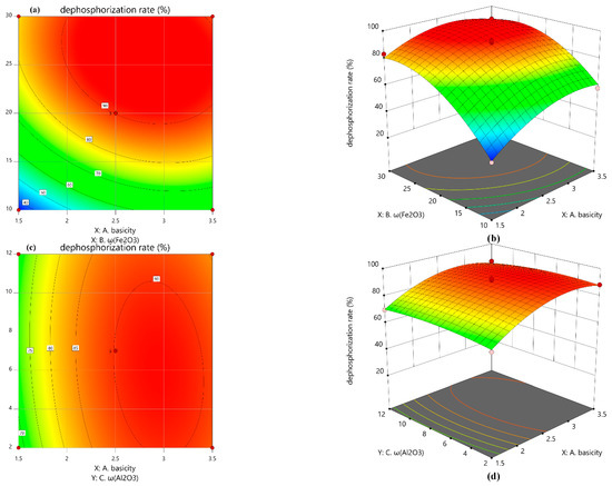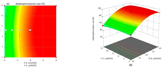 Al2O3 did not directly participate in the dephosphorization reaction, but it reacted with high-melting-point compounds to reduce the melting point of the slag, improve the fluidity of the slag, and promote dephosphorization. However, the high content of Al2O3 causes the basicity and ω(Fe2O3) to be reduced, and the phosphorus content in Ca2SiO4 will also be reduced [22], resulting in a lower rate of phosphorus removal. Therefore, the interaction between basicity and ω(Al2O3), ω(Fe2O3) and ω(Al2O3) had no significant effect on the rate of phosphorus removal, so the distortion of the response surfaces of (c) and (e) were low. It could also be seen from the contour plots of (d) and (f) that the dephosphorization rate was less affected by the change in Al2O3 content.