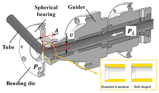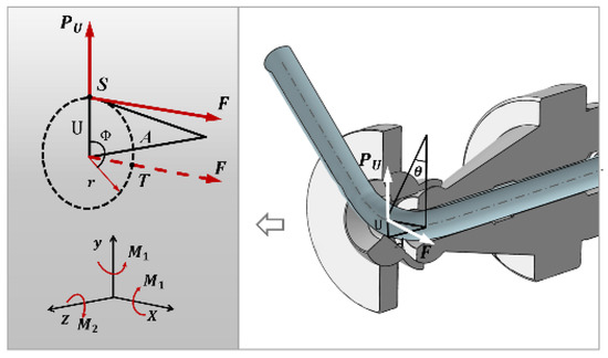The bending die imposes a force F perpendicular to the current bending plane and a force PU parallel to the current bending plane on the tube. At the same time, the contact position between the tube and the guider structure generates the corresponding reaction force due to friction and other factors. The force PU forms the bending moment M1 in the Z–Y plane (Cartesian coordinate system) to maintain the current bending state of the tube. The force (F) and eccentricity (U) form a rotation torque M2 in the X–Y plane, which promotes the tube to rotate around the central axis of the unformed section. Torque M3 formed in the Z–X plane by the force (F) of the bending die on the tube and the length (A) of the bending deformation zone may cause additional bending deformation of the tube in the Z–X plane.
