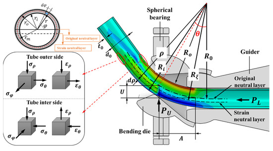 Although the tube no longer has noticeable bending deformation in the deflection process, it still shows a tendency to bend deformation. Therefore, it is necessary to analyze the stress–strain state of the hollow metal tube. As shown in Figure 2, to simplify the analysis, the three-dimensional deformation state of the tube was simplified as a plane deformation state, where the tangential strain εθ along the axis direction of the tube, the radial strain ερ along the bending radius and the circumferential strain εφ around the circular direction of the tube are the principal strains. The analysis of the tube’s bending stress and strain state observes the following basic assumptions: (a) the deformed tube is an ideal rigid plastic material; (b) neglecting the flattening distortion caused by circumferential material flow in the cross-section of the tube, ; (c) the bend deformation of the tube conforms to a volume incompressible condition [20].