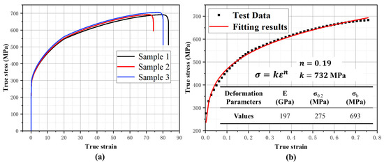 Standard uniaxial tensile test of the SUS304 stainless steel tube: (a) true stress–strain curve; (b) hardened model of the SUS304 stainless steel tube.