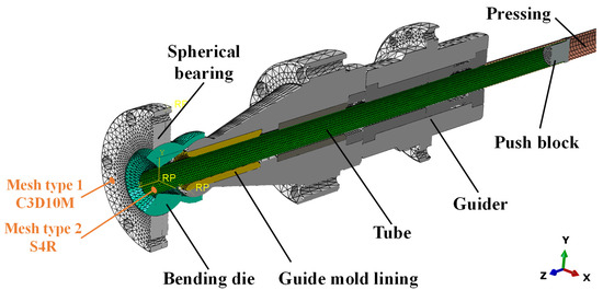 As depicted in Figure 6, a finite element model was established to study the influence of the deflection avoidance process on the forming of the tubes, and the simulations were carried out under different trajectory radii and different guider structures. The FEM mainly included the bending die, spherical bearing, guider, tube, pressing mechanism, propulsion device and other components. The bending die, guide structure and other mold parts without deformation were set to a rigid entity type, and the grid type was selected as the C3D10M format [21]. The tube blank was defined as a shell type with five integral nodes and the S4R format was selected for the mesh type [22]. The mid surface of the tube was used for modeling, allowing the extraction of data such as stress–strain, location coordinates and wall thickness. The 3D-FBF mechanism and the contact relationship between the tube blank made a setting for the general contact. According to Coulomb’s theory, the friction coefficient between the tool and the tube was described as 0.05 [23]. The mass scaling factor was set to 1000, and the target time increment was adopted to obtain a more stable bending condition and sufficient computational efficiency concurrently for the dynamic effect of the ABAQUS/Explicit module. The specific motion parameters of the finite element model are shown in Table 3 [12,24,25].
