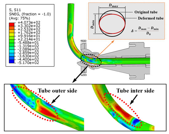 Figure 7 and Figure 8 show the numerical simulations and experiments (U = 12 mm) to investigate the effect of the active deflection processes on the tube. The radial stresses at the primary deformation zone (S11, the normal stress in X, Unit: MPa) were compressed inside and outside of the bending section, which is consistent with the theoretical analysis of Equations (15) and (16). The deflection angle of the finite element simulation was φ = 78.60° and the actual deflection angle was φ = 43.64°. Moreover, elliptical distortions were produced in the cross-section at the location where the tube was in contact with the guide structure. The actual cross-section distortion at the contact position before deflection was Δ = 7.23%, as illustrated in Figure 7, while the finite element simulation was 8.40%, with an error of 16.18%.