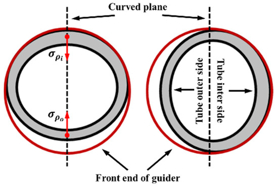 Substituting Equations (13) and (14) with Equations (11) and (12) obtains the distribution of the radial stress of the bending tube, as shown in Equations (15) and (16)