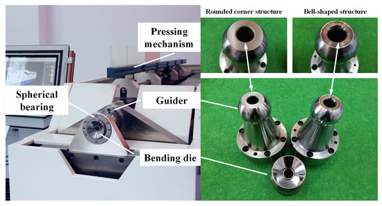 To verify the results of the theoretical analysis and simulation, active deflection experiments were conducted with the same process parameters. As shown in Figure 14, the active deflection experiment was implemented by three-axis free bending forming equipment (NUAA-G30: designed and manufactured by Nanjing University of Aeronautics and Astronautics, Nanjing, China). The bending forming and active deflection experiments under different transition structure conditions were carried out by replacing the guide structure. With the exception of this, the other forming mechanisms maintained full consistency.
