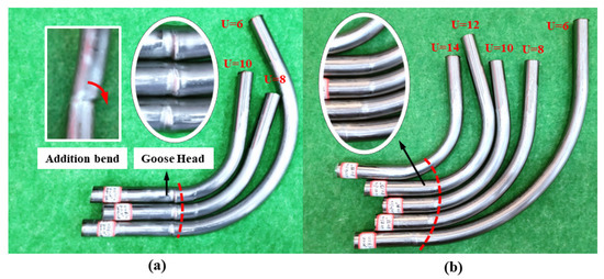 - The active deflection method led to the redistribution of the tube’s section distortion, and the stress concentration exacerbated the section distortion degree and even caused more serious forming defects such as goose-head. In addition, the greater deviation of the angle is one of the primary problems of the active deflection method.