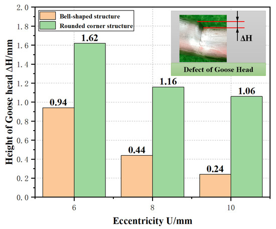 The cross-section distortion maintains the same positive correlation trend with the eccentricity before and after the deflection, as shown in Figure 18 for the active deflection experiment by adopting the bell-shaped transition structure. It further proved that the value of the cross-section distortion was mainly determined by the bending degree of the tube. Compared with the rounded transition structure in Figure 15a, the goose-head phenomenon was apparent only at small eccentricities, as shown in Figure 15b when the bell-shaped transition structure was employed. The small eccentric distance did not provide enough deflection torque to drive the pipe through large angles; hence the work performed by the bending die on the pipe was consumed by additional bending. However, the goose-head phenomenon still disappeared gradually as the eccentricity increased as shown in Figure 17. Due to the expanding deflection moment, active deflection of the tube was more easily achieved. Simultaneously, stress concentrations continuously moved along the circumferential direction of the tube in deflection and were uniformly distributed throughout the cross-section, thus reducing severe deformation of the cross-section.