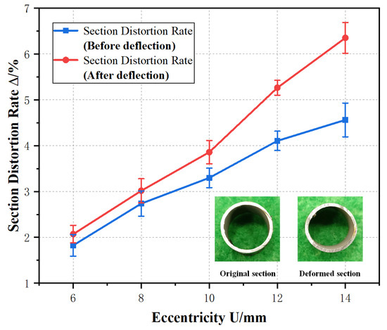 The variation in cross-section distortion with eccentricity is depicted in Figure 11a. In general, the cross-section distortion rate front–back of the deflection increased with the eccentricity. When U = 14, the cross-section distortion rate reached the maximum values of 9.71% and 10.57%, respectively. The transverse section aberration rate had a small increase after deflection and only slightly expanded at U = 6 mm and U = 14 mm, reaching 1.42%. The main reason is that before the active deflection, the bending radius decreases gradually with higher eccentricity, and the degree of bending keeps deepening. The radial stress amplitude grows with the deepening of the bending degree, which enhances the radial deformation of the tube wall and intensifies the deformation of the section. As the deflection only changes the tube direction and not the bending radius, the active deflection process has a small effect on the distortion extent of the tube cross-section and only causes redistribution of the section shape. Nevertheless, since the hindering effect of the tube segment deformation increases with eccentricity, the target deflection angle cannot be achieved even when deflection is performed at a larger eccentricity. This phenomenon explains why the growth rate of the deflection angle slows down with the expansion of eccentricity. Therefore, the eccentricity (or trajectory radius) of the bending die is the majority factor in determining the deflection angle, with other conditions remaining constant.