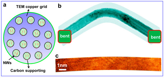 (a) Schematic showing the twin-structured Ni NWs scattered on the previously broken TEM grid, which was covered by colloidal thin films. (b) An example showing that a single NW could be bent using the colloidal thin films. (c) HTEM image showing the highly bent, arc-shaped {111} lattices.