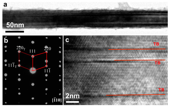 (a) TEM image showing the microstructure of twin-structured Ni NWs. (b) The corresponding selected area electron diffraction patterns captured along the direction, indicating the presence of (111) twins in the NWs. (c) HTEM image revealing the growth of several twins in the Ni NWs.