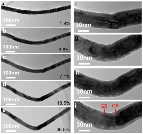 (a–e) Low-magnification bright field TEM images showing the evolution of the nanoscale structure of a Ni NW with growth twins under the bending strain of 1.9–36.5%. (f–i) Enlarged TEM images show two GBs generated in severely bent Ni NWs.