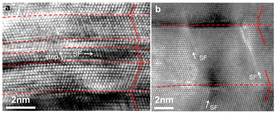 To demonstrate how the twin-structured Ni NWs accommodated the plasticity under bending deformation, their atomic-scale deformation mechanisms at different straining stages were investigated. At very low strain values, partial dislocation activities frequently occurred. In twins with a thickness of ~2.4 nm, partial dislocation glide on the {111} plane, which was parallel to the TBs, was the dominant plastic activity. Figure 4a shows the HTEM image captured along the zone axis during bending deformation. In Figure 4a, many steps on the original flat TBs in the thinner twins are observed. These steps resulted from the nucleation and gliding of the partial dislocations on the TBs, which was the dominant plastic deformation event in twins with thicknesses below ~6 nm. In the thicker twins, partial dislocations resulting in stacking faults (SFs) were frequently observed. These partial dislocations intersected with the TBs during the bending of the NWs. Figure 4b shows a typical HTEM image captured after the occurrence of plastic deformation. As shown in Figure 4b, most of the partial dislocations intersect with the TBs. These dislocation activities were frequently observed in twins with thicknesses greater than ~6 nm, indicating a considerable effect of twin thickness on the deformation mechanism of the metallic NWs. Similar observations have been reported for twin-structured nanocrystalline Cu [3,4,25,26,27,28,29,30,31,32,33,34,35].