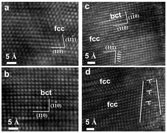 Interestingly, the square-shaped lattices were also reversed by localised strain relaxation, such as dislocation nucleation in the bct-structured region. Figure 5c,d show a complete reversal of the fcc–bct transition after the bct lattice region is interrupted by dislocation nucleation. As shown in Figure 5c, the lattices are square-shaped, corresponding to the bct lattice. Based on the values reported in previous studies, the measured lattice distances are very close to those of the bct-structured Ni viewed along the [001] zone axis [36,37,38,39,40]. This result directly confirms the occurrence of a phase transformation in the Ni NWs under bending strain and the dependence of the deformation mechanism on the deformation stage. With increasing bending strain, as shown in Figure 5d, three full dislocation nucleations made the square lattices revert to the parallelogram shape and caused the lattice angle of the two {111} planes to return to ~70.5°, indicating a reversible fcc–bct phase transformation.