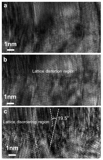 As the bending strain increases to a very high level (greater than ~18.5%), the formation of GBs was activated. Figure 6 shows three zone-axis HTEM images (captured at different deformation stages) detailing the GB formation mechanism. Figure 6a presents the HTEM image before the GB generation in the Ni NW under bending train. At this high-bending-strain stage, the lattices are highly curved, and the lattice strain is nonuniform in this local region. As shown in Figure 6b, with increasing bending strain, the original parallelogram-shaped lattice becomes highly distorted. With a further increase in the bending strain, the lattice in the local region becomes disordered, and a tilted GB with an angle of ~19.5° is induced, as shown in Figure 6c. This disordered lattice spreads in the entire GB region, and no disclination or well-arranged dislocations are observed. These results, in contrast to those of previous studies, indicate that GB generation can also occur through lattice collapse [41,42,43,44].