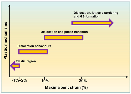 The NWs are first in the elastic strain region at the strain below ~1%. At the maximum bending strain below ~10%, plastic deformation is controlled by dislocation slips. At the bending strain of ~10–18.5%, phase transition occurs. At the bending strain above 18.5%, a GB is formed.